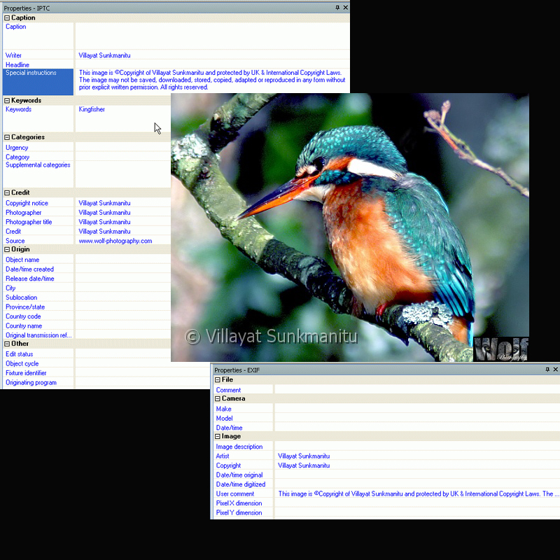 Under 'User comment' in the 'EXIF' I added: This image is ©Copyright of (your name) and protected by UK & International Copyright Laws. The image may not be saved, downloaded, stored, copied, adapted or reproduced in any form without prior explicit written permission. All rights reserved. Moral rights asserted in all countries and under any acts that may require such assertion.